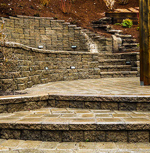 Allan Block Walls, Paving Stones, Waterfall, Cedar Pergola, Low Voltage Lighting, and Landscaping in North Vancouver